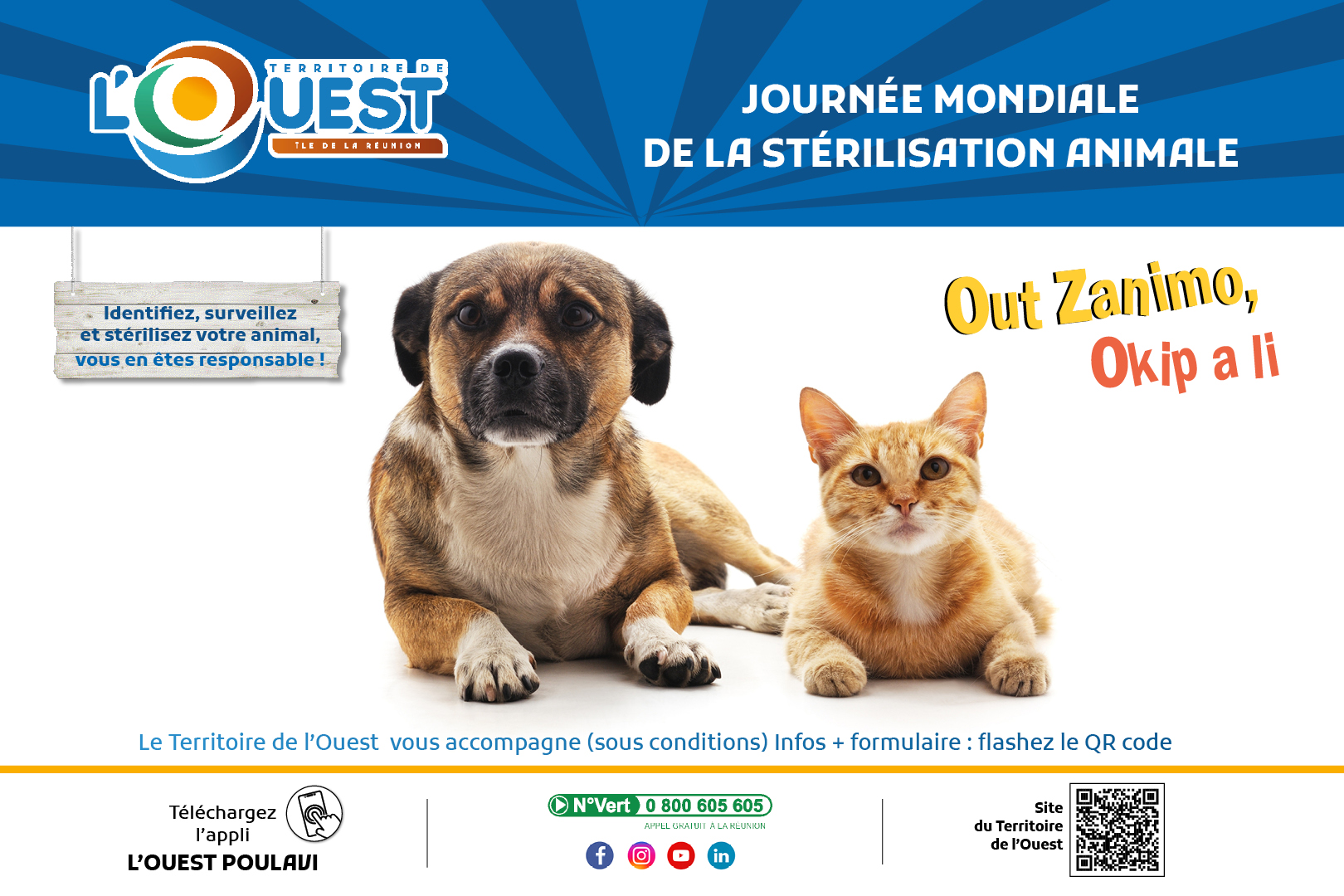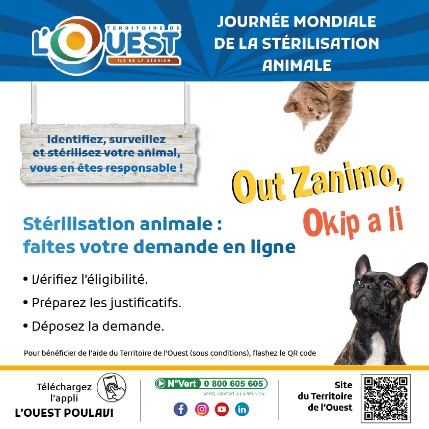 Le Territoire de l’Ouest propose un dispositif d’accompagnement pour la stérilisation des chiens et des chats, sous conditions.