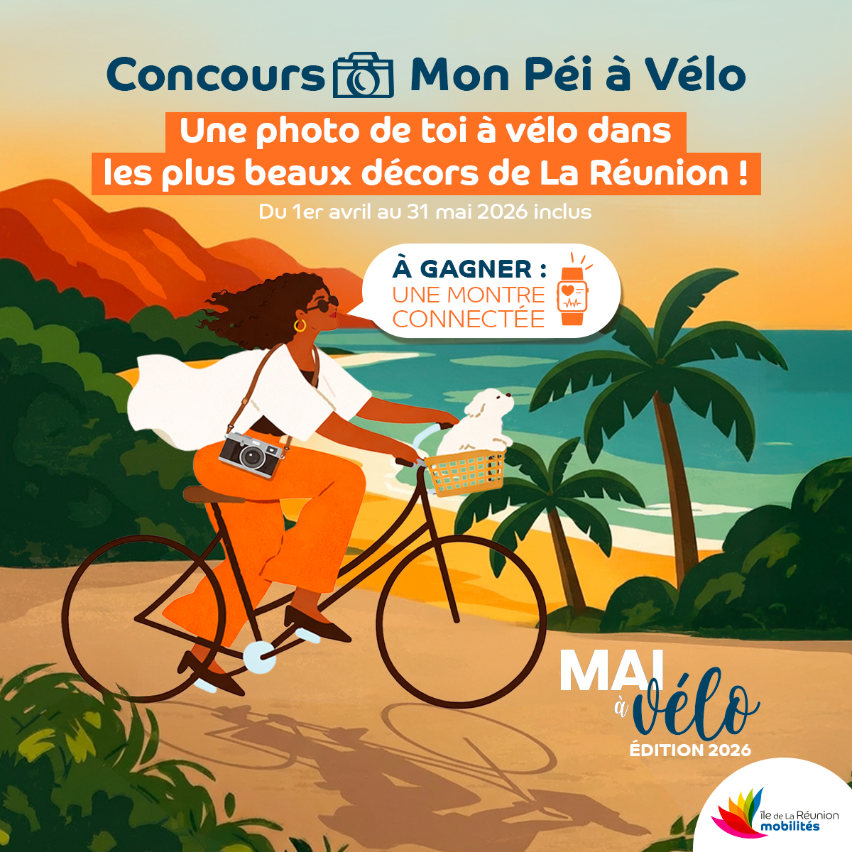 Autre animation proposée dans le cadre de Mai à Vélo 2026 : le concours photo « Mon Péi à vélo ». Le principe : prendre une photo de vous avec votre vélo dans un lieu emblématique de La Réunion, puis la déposer en ligne. La photo gagnante remportera une montre connectéeLes candidatures sont ouvertes du 1er au 23 avril 2026. Une présélection sera ensuite réalisée par Île de La Réunion Mobilités selon plusieurs critères, dont la qualité de la photo, la mise en valeur du lieu et l’originalité. Les photos retenues seront soumises au vote du public sur la page Facebook d’Île de La Réunion Mobilités du 1er au 31 mai 2026.