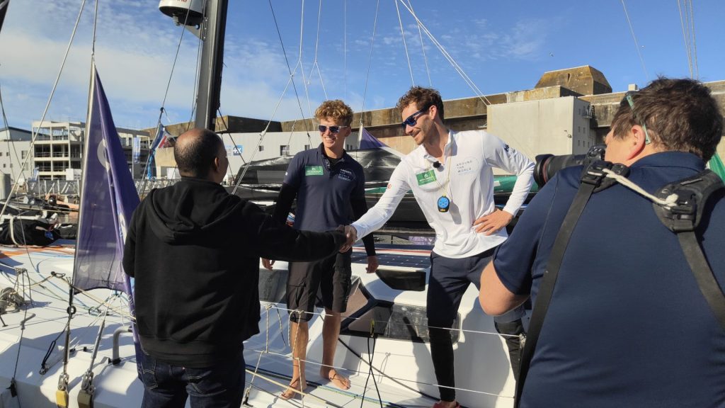 La veille, en attendant l’arrivée de l’équipage du bateau réunionnais, Emmanuel Seraphin est allé féliciter les trois premiers du classement final : les Français de Crédit Mutuel, Belgium Ocean Racing et les Allemands de Next Generation Boating Around The World.