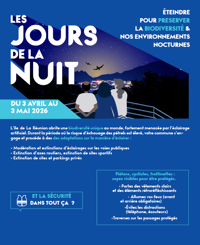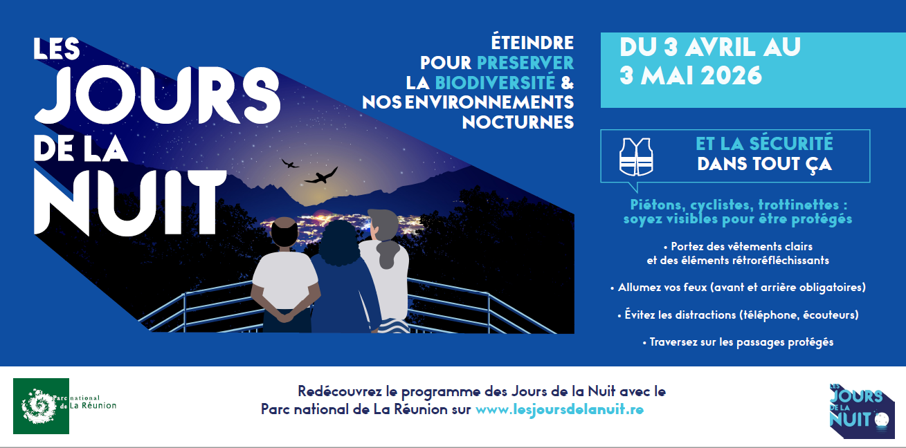 L’édition 2026 des « Jours de la Nuit » a lieu du vendredi 03 avril au dimanche 3 mai 2026. L’objectif de cette action est de préserver la biodiversité de notre île en éteignant les éclairages qui perturbent l’envol des pétrels et la reproduction des tortues.
