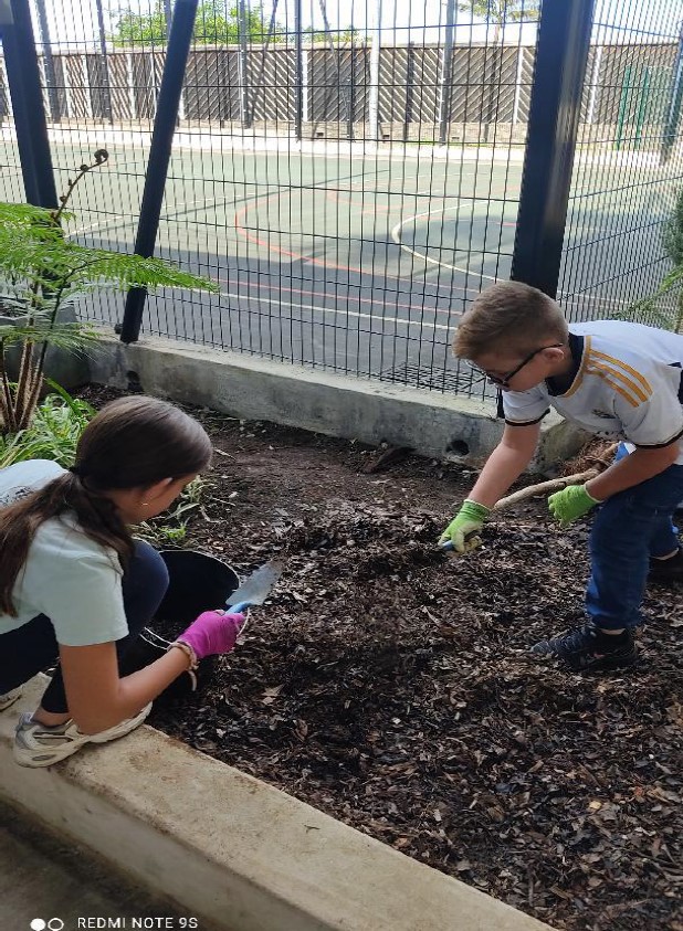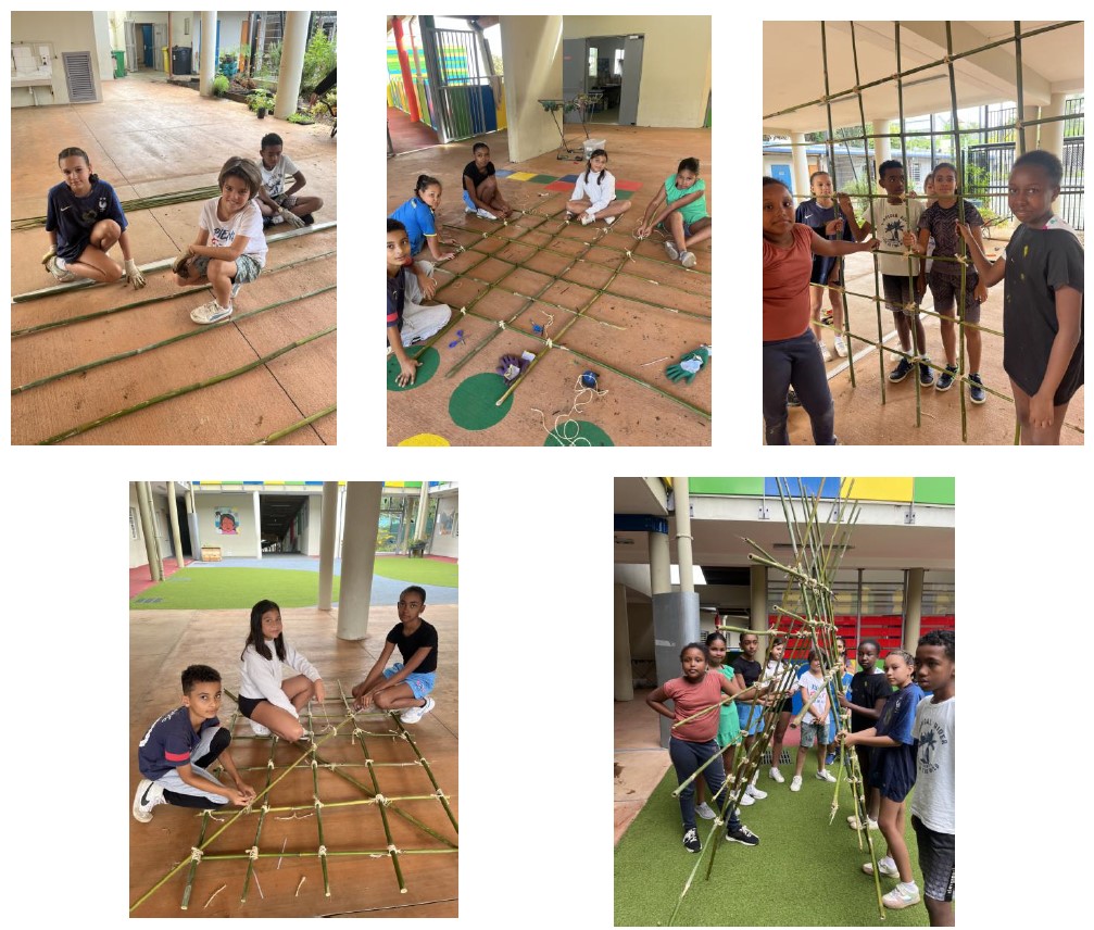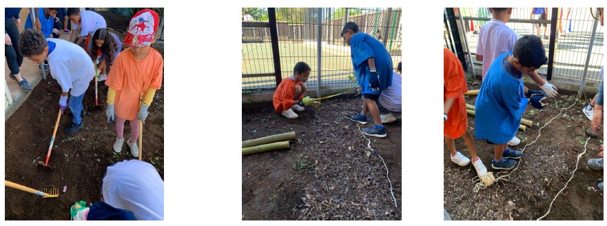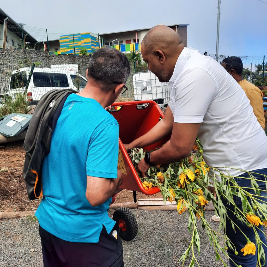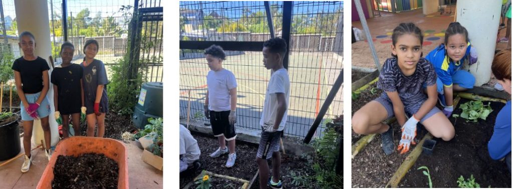 -Nous avons réalisé des carrés potagers et des chemins pour structurer l’espace et accéder facilement aux différents carrés potagers. Nous y avons planté : des œillets pour que les abeilles puissent polliniser, attirer les coccinelles et éloigner les insectes ravageurs, de la courge, des fraises, des radis, de la salade, du maïs, du pipangaille…