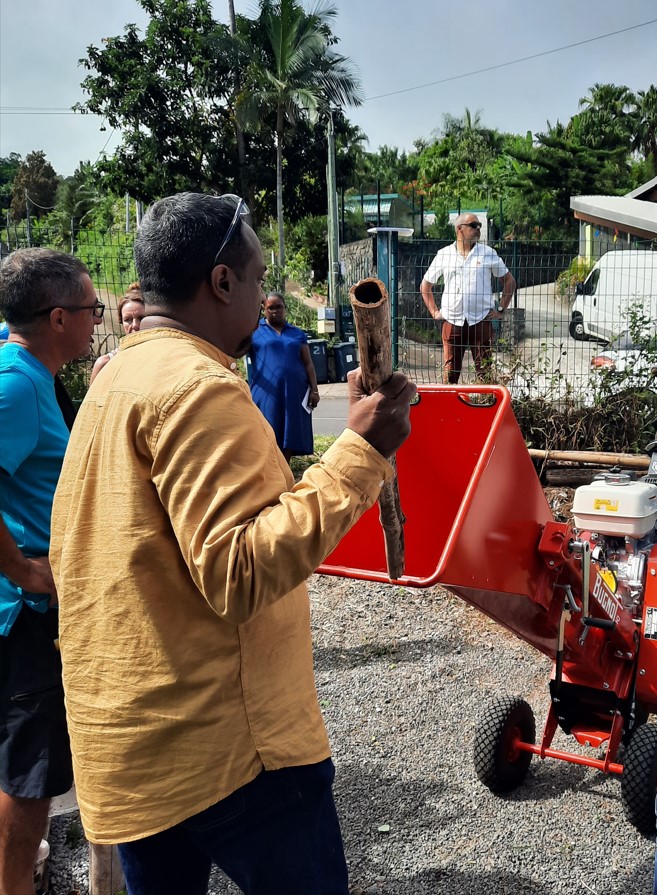Les enseignants aussi mettent la main à la pâte, ils utilisent le broyeur de l’école pour réaliser du broyat qui servira de paillage afin de limiter l’arrosage.
