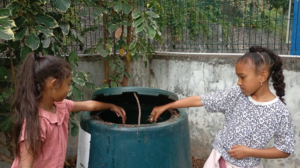 Puis il y a eu un intervenant sur le compost. Bien que l’on composte déjà à Piton A, nous n’avions pas encore toutes les informations nécessaires pour avoir un compost de qualité. Ils ont appris que la chaleur jouait un rôle important dans le compostage, qu’il fallait remuer régulièrement les déchets végétaux et qu’on pouvait y mettre aussi les papiers krafts qui enveloppent les viennoiseries de la boulangerie, que certaines petites bêtes du jardin jouent un rôle fondamental dans le compostage.
