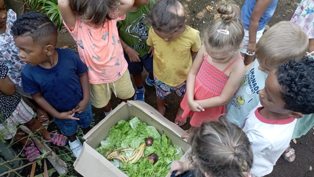 Chaque jour de la semaine une classe est responsable de la collecte des épluchures des légumes au menu du jour de la cantine. Les enfants identifient et nomment les légumes avant de les introduire dans le bac à compost. Les épluchures sont ensuite recouvertes de matière sèche et mélangées dans le bac.