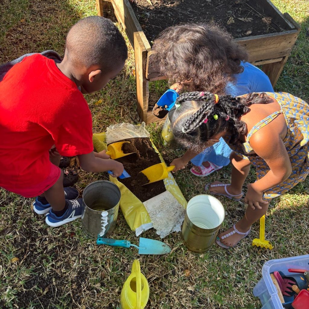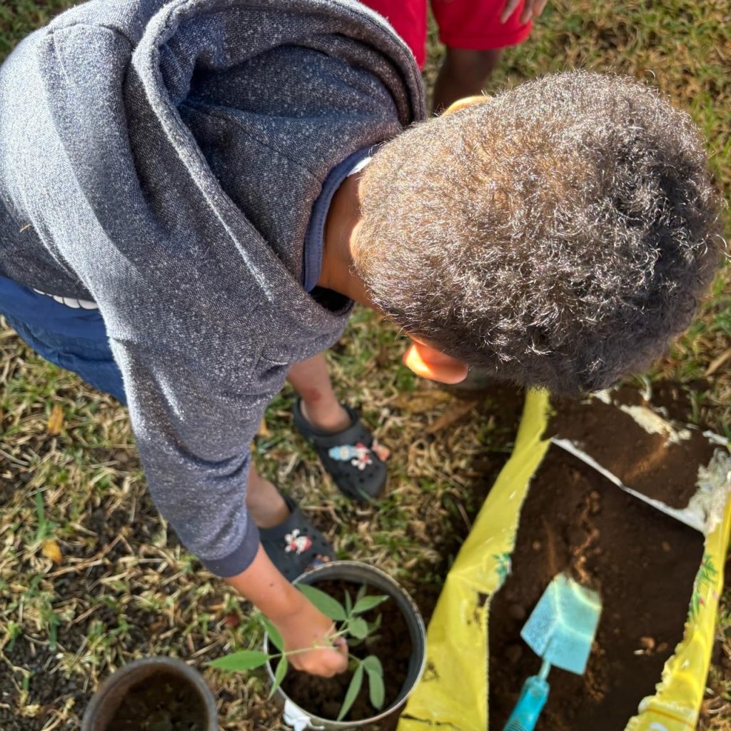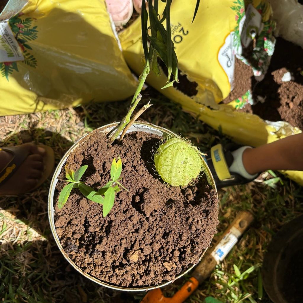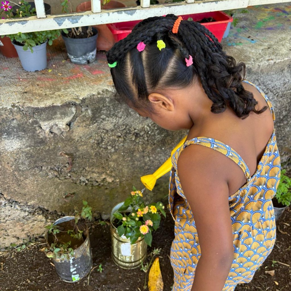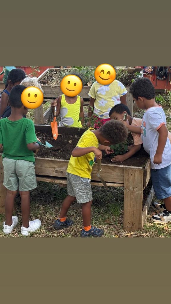 Pour cela, nous avons planté et semé des graines de plusieurs plantes à fleurs telles que le Géranium, le Ti-ouette, l’arbre à ballons, l’Héliotrope amplexicaule, l’Ambrevade, la Sensitive, le Pourpier, le Citron, la Mandarine, la Liane poc-poc, et le Galabert.