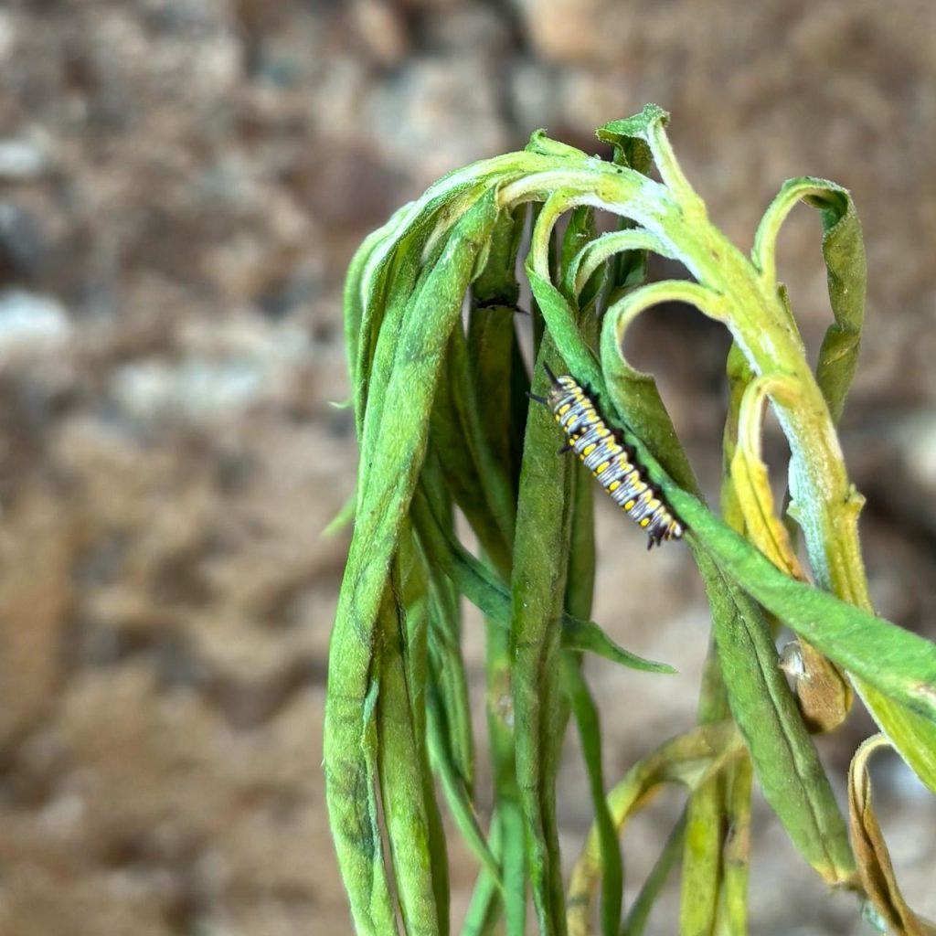 Nous avons pu observé notre première chenille, la chenille du Monarque africain sur la plante Ti-ouette apporté par une mamie.