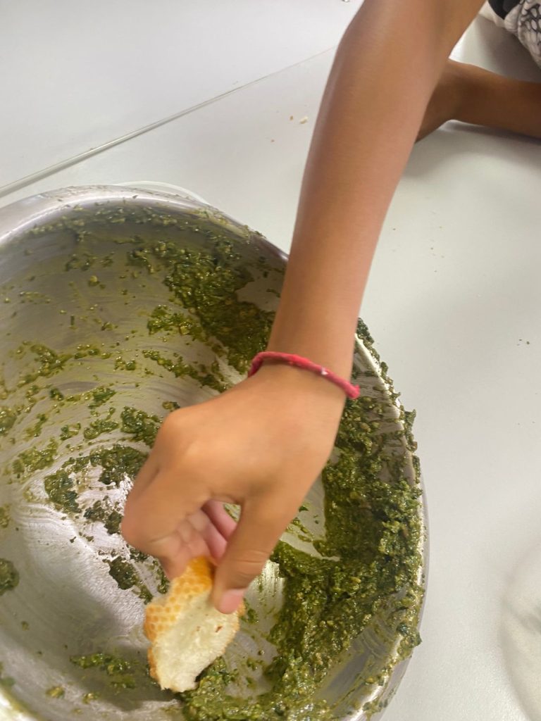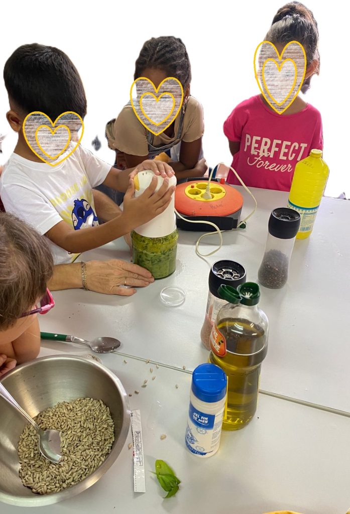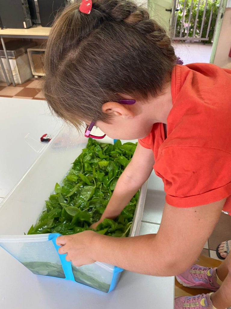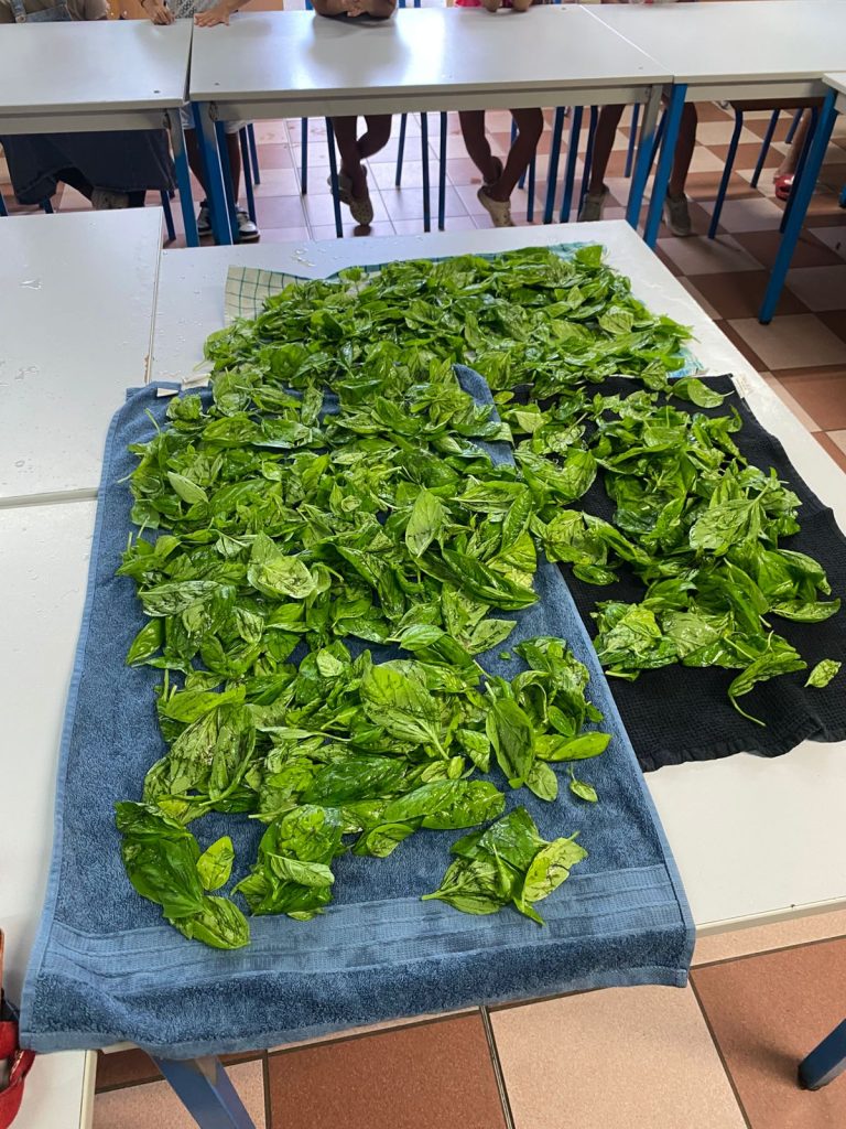 Nous avons d’abord cueilli les tiges puis nous les avons effeuillées avant de , soigneusement, laver les feuilles. Ensuite, avec nos maitresses, nous avons réalisé leur recette en mixant le basilic avec de l’huile d’olive, du parmesan, beaucoup de parmesan, du sel, du poivre et des graines de tournesol.