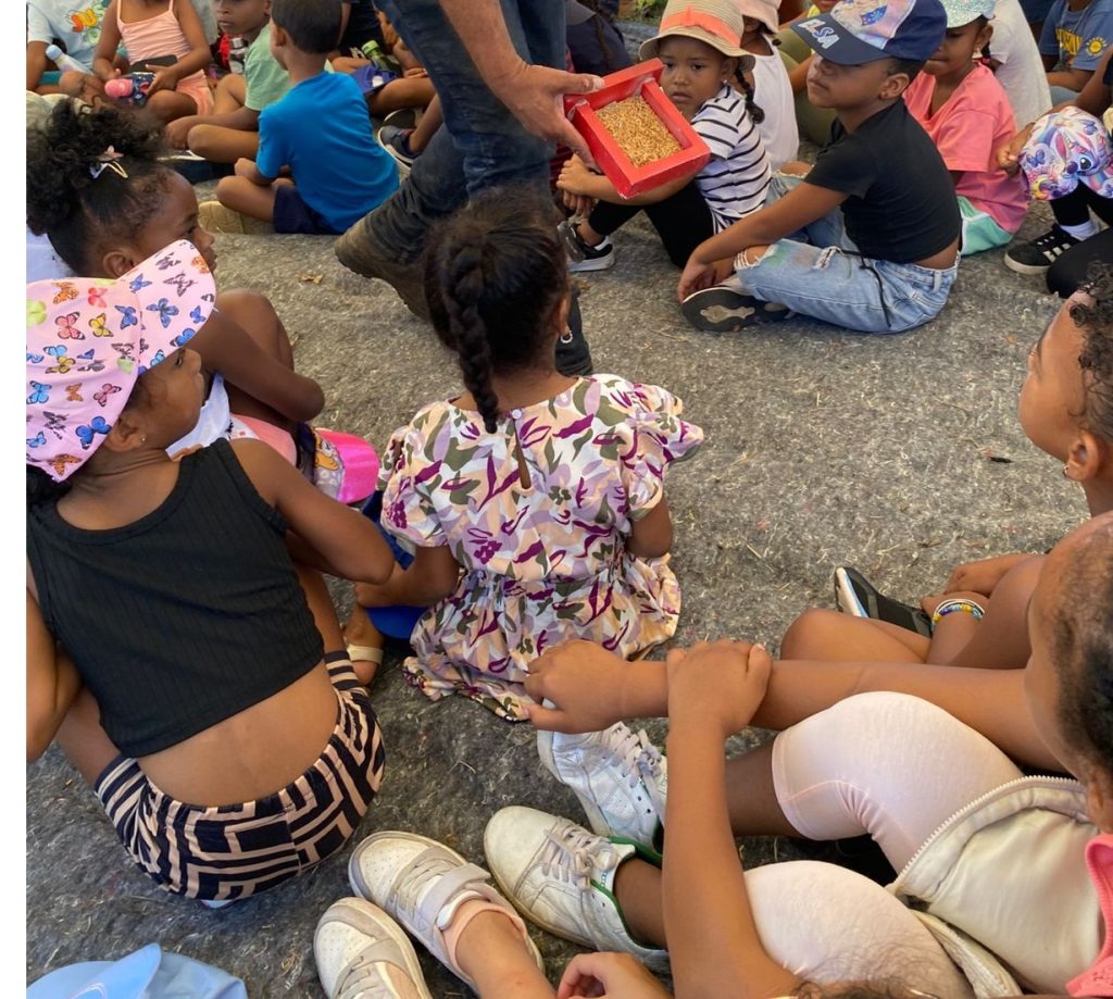 Après ces découvertes, nous sommes allés dans le champ pour planter du riz. Nous avons utilisé des graines spéciales : ce sont des grains de riz gardés de la récolte précédente.