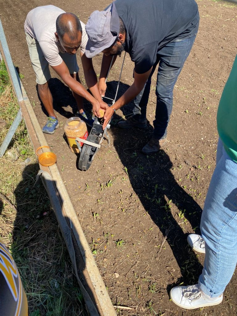 Pour planter, nous avons utilisé un semoir manuel. Il ressemble à une petite brouette. Il permet de faire un sillon dans la terre, de déposer les graines de façon régulière, puis de refermer le sillon en passant.