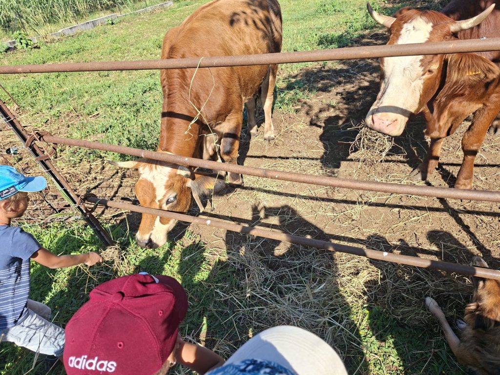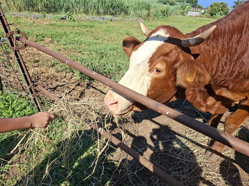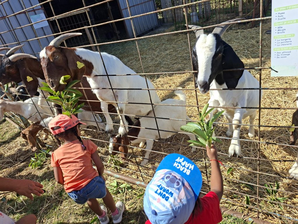 On a pu nourrir les vaches, les moutons et les cabris avec du foin et des feuilles coupées ! Ils se sont régalés et nous on a beaucoup rigolé !