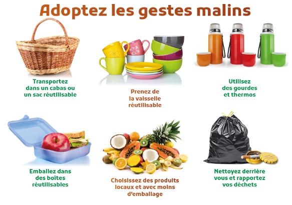 - privilégier les contenants réutilisables (boîtes, gourdes, sacs en tissu),